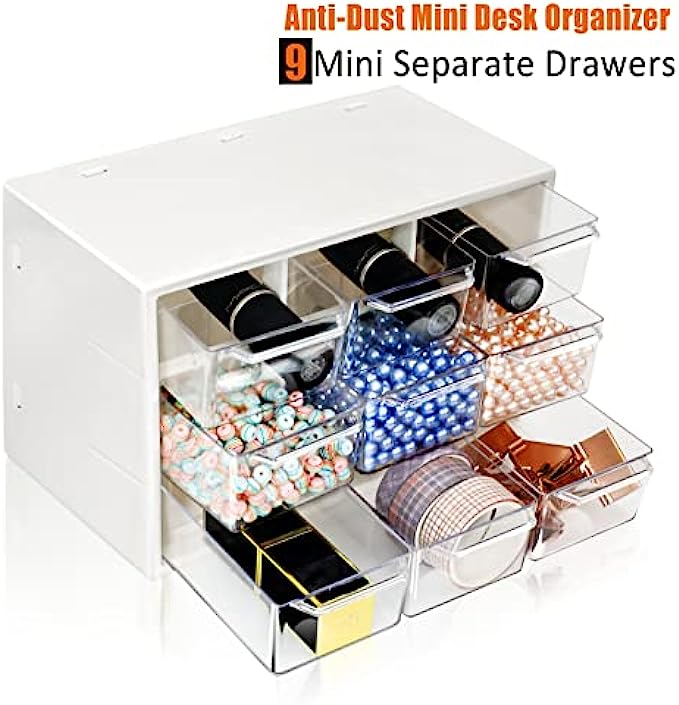 【9-DRAWER DESIGN】 9 separate sliding plastic drawers not only hold all your smaller items, but also keep the little stationary separate and neat. Keep your work space clutter-free and your supplies close at hand.