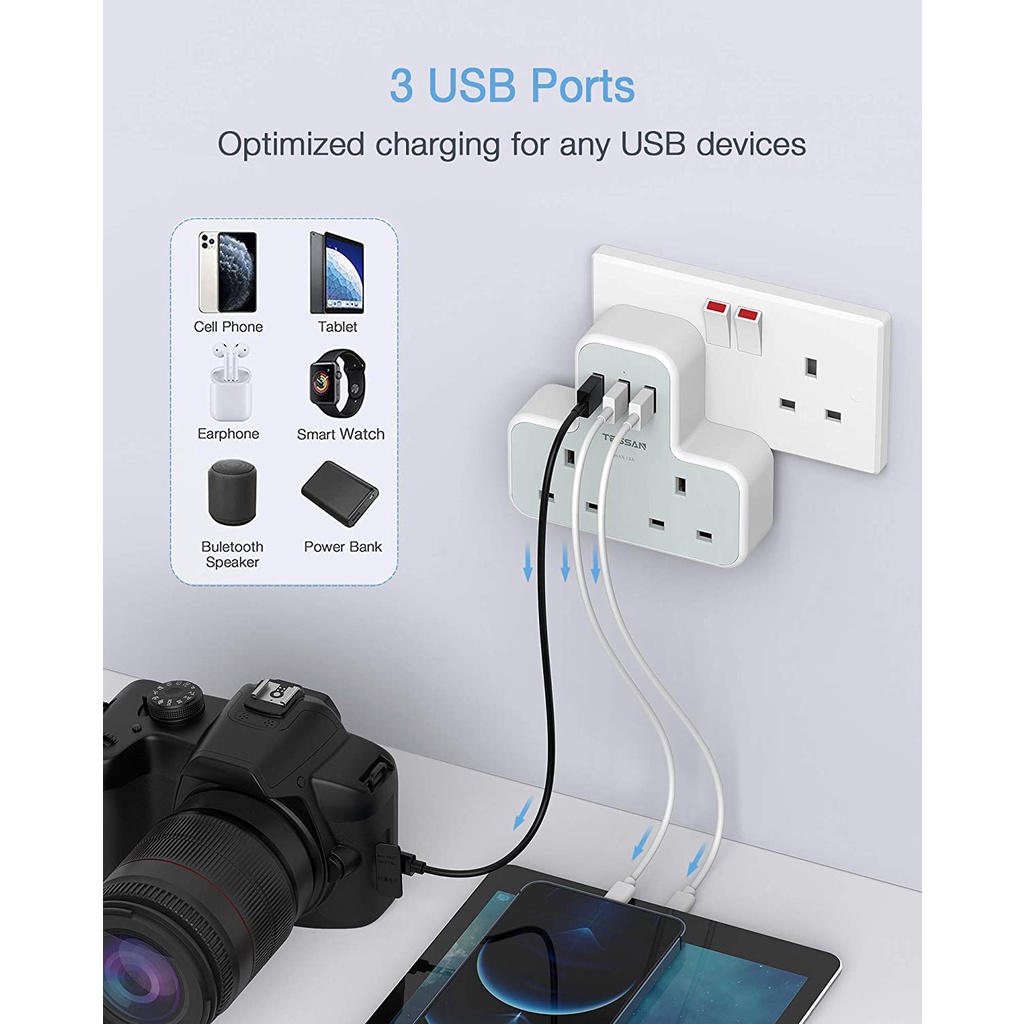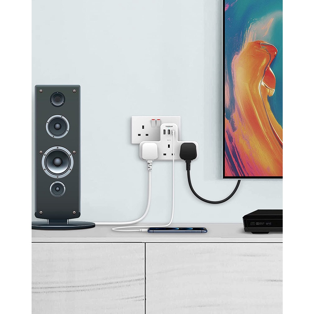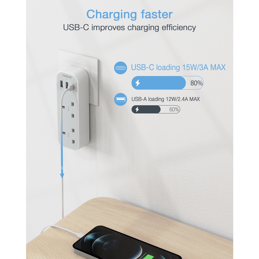 TESSAN Multi Plug Extension Power Adapter with USB(Type C), Surge Protector Plug Extension Socket Wall Charger Adaptor with USB C, High Quality Power E