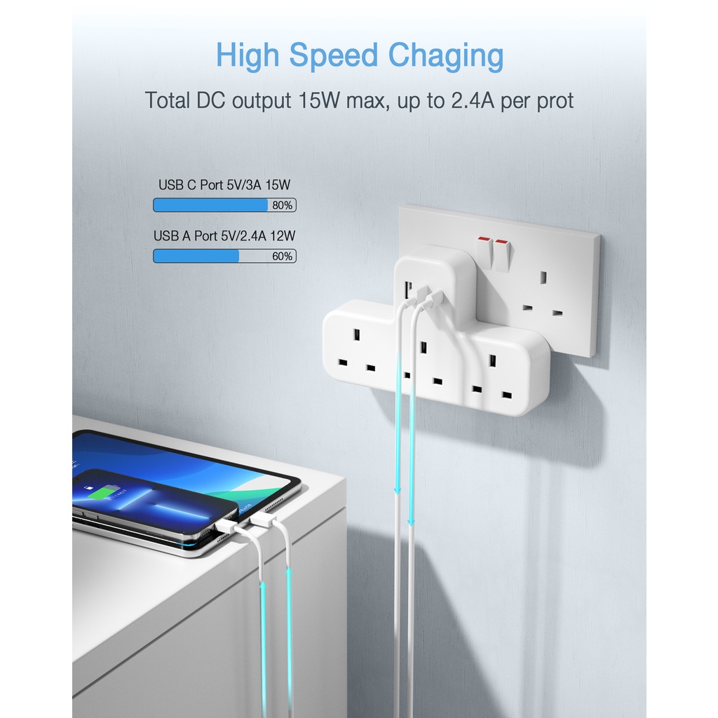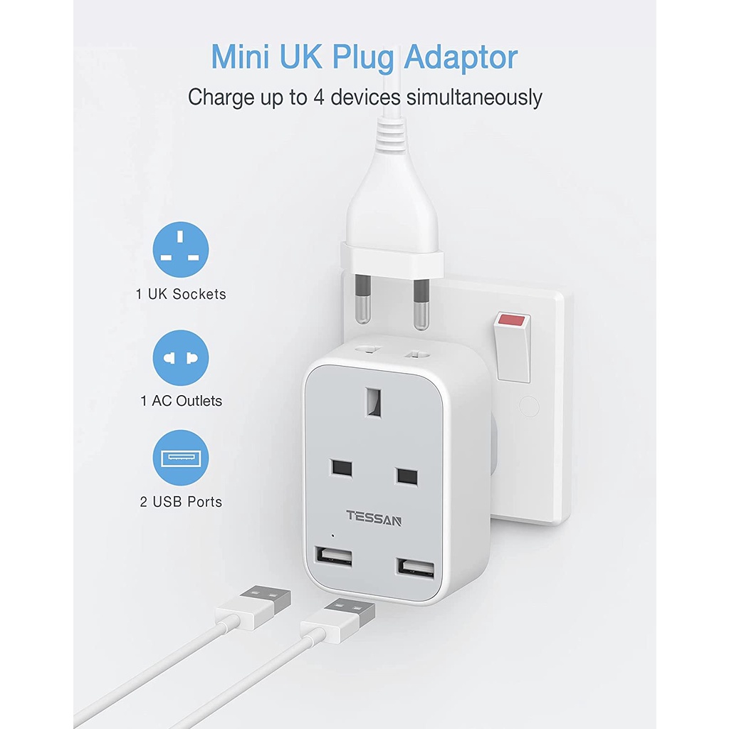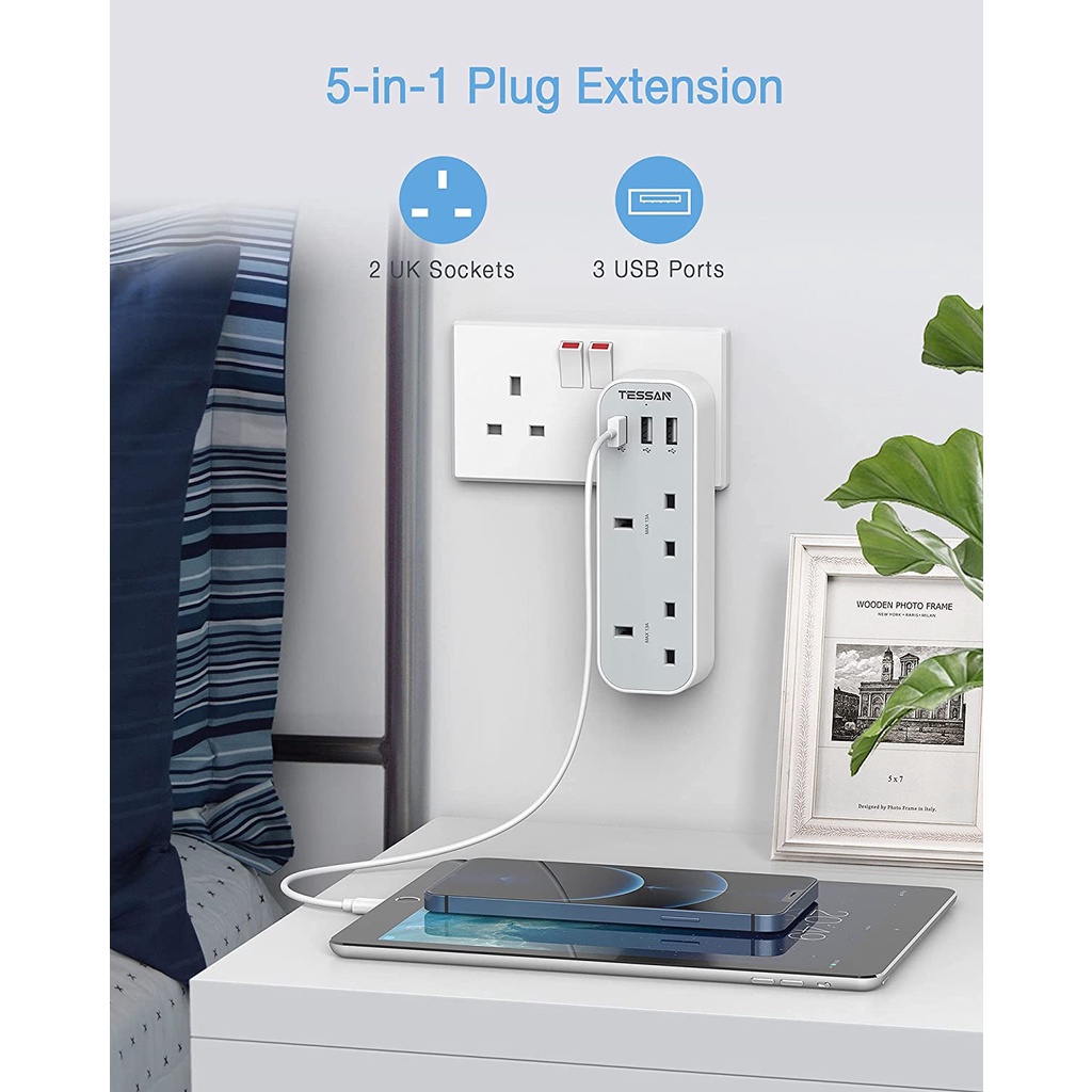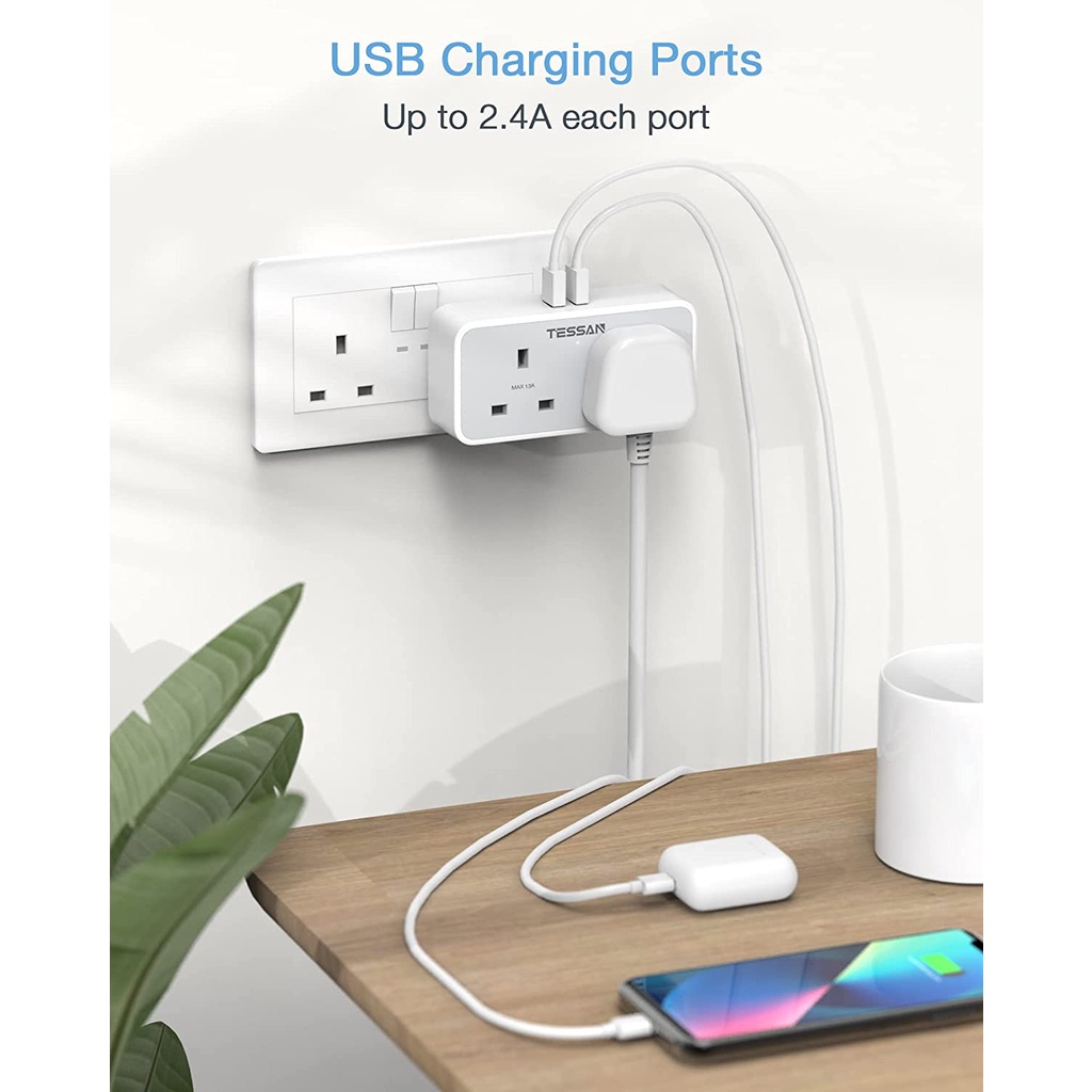 TESSAN Multi Plug Extension Power Adapter with USB(Type C), Surge Protector Plug Extension Socket Wall Charger Adaptor with USB C, High Quality Power E
