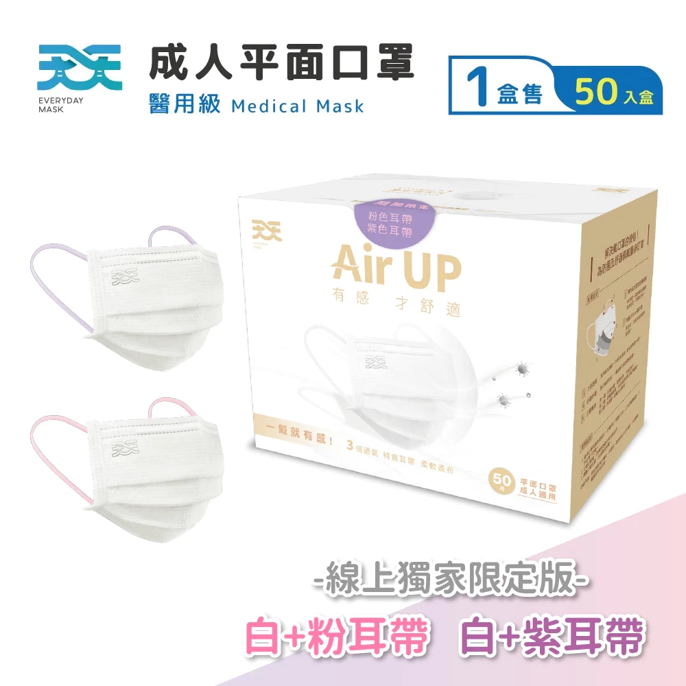 Adult Flat Medical Mask (Limited White with Pink & Purple Ear Straps) – 50 Pieces per Box | 1 Carton = 50 Boxes (2,500 Pieces Total)